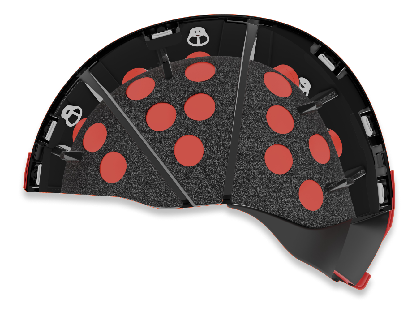 Our dual-stage liner utilises shear-thickening non-Newtonian PU foams that are naturally soft, but harden instantly in response to impact, delivering a dynamic foam hardness that intelligently protects from small impacts to big hits.