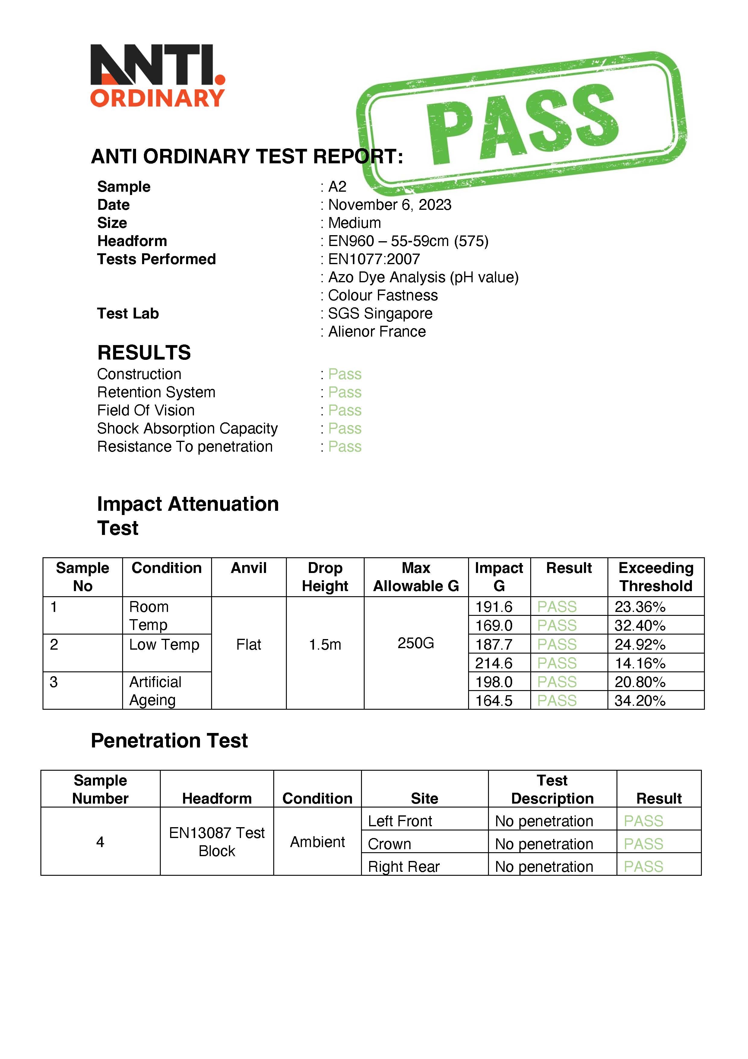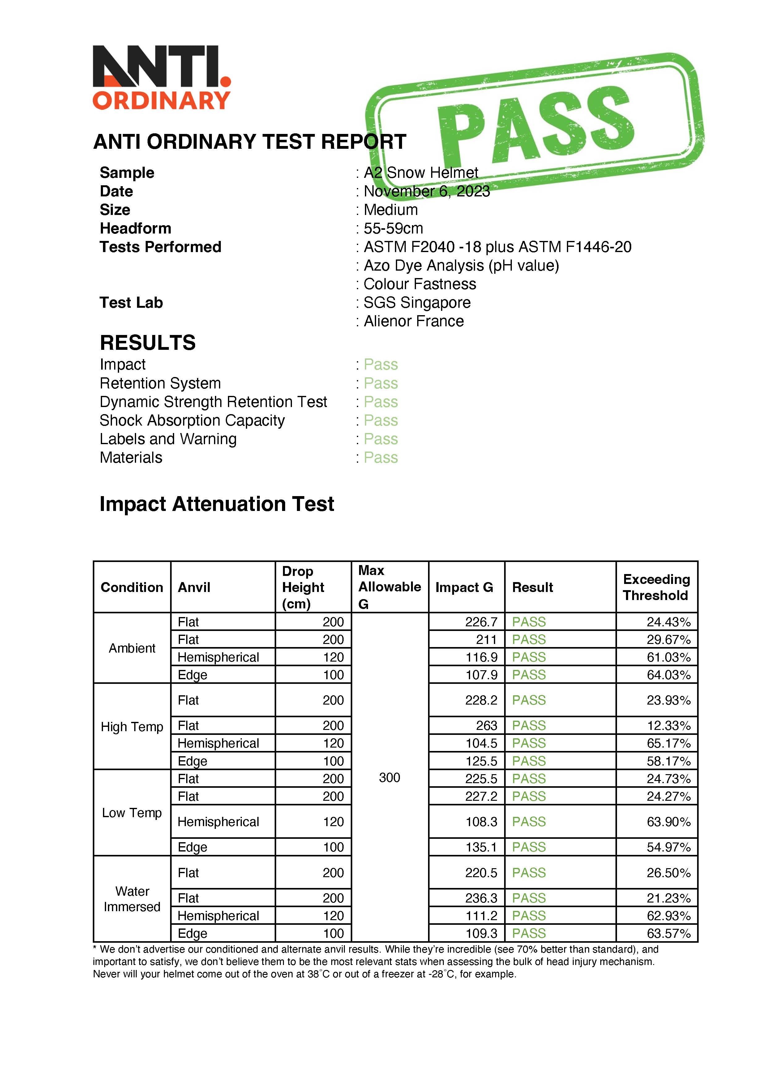 The Anti Ordinary A2 is certified to and significantly exceeds the EN1077 (European) and ASTM F2040 (USA) helmet certifications standards. Both certifications drop a steel headform from a pre-determined height.